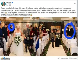 The post, which detailed the mystery man’s inexplicable presence in the wedding photos, was seen by a man who had been living with the same confusion for years.