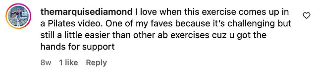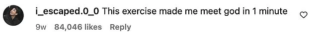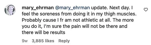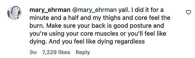 The video immediately garnered significant interest from followers who were intrigued by the idea of a workout that could be completed so quickly. Many users shared their experiences after trying out Dora’s exercise routine for themselves. One user commented, ‘I did this for a minute and a half, and my thighs and core feel the burn. Make sure your back is good posture and you’re using your core muscles or you’ll feel like dying.’ Another reported feeling soreness in her thigh muscles the following day.