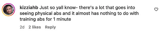 However, not everyone is convinced by Dora’s assertion that merely doing one minute of this exercise daily will yield visible abs. Critics pointed out that physical transformations involve more than just targeted exercises; they require a balanced diet and other forms of physical activity as well. ‘Just so y’all know – there’s a lot that goes into seeing physical abs and it almost has nothing to do with training abs for one minute,’ warned a commenter.