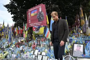 The Duke of Sussex, 41, was seen at a makeshift memorial in Independence Square Maidan, where he described the tribute to fallen soldiers as ‘the most insanely sad yet beautiful thing.’ His visible distress as he reflected on the care and love poured into each photograph, flag, and memento at the site underscored the human cost of Russia’s invasion. ‘I’ve never experienced anything like that before,’ he said, his voice trembling as he acknowledged the sacrifices of those memorialized.