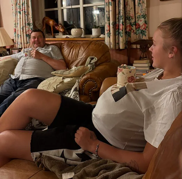 Even Paul Hughes, JoJo’s potential future father-in-law, has been spotted on adjacent leather sofas with his daughter-in-law-to-be, their matching poses—her cushion stuffed inside her t-shirt, his tea resting on his own paunch—hinting at a bond forged over shared moments of levity and connection.