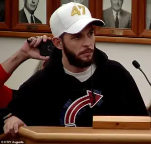 His voice, sharp and confrontational, cut through the room as he lambasted the board for upholding the state’s anti-discrimination laws. ‘You guys had the opportunity tonight to be heroes and you guys became zeroes,’ he declared, his words met with a mix of applause and boos from the crowd.