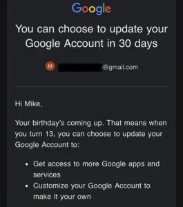 That means when you turn 13, you can choose to update your account to get more access to Google apps and services.’