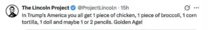 The Lincoln Project, a prominent anti-Trump organization, recently sparked controversy with a social media post that likened the economic policies of former President Donald Trump to a meager meal consisting of one piece of chicken, one broccoli, one corn tortilla, one doll, and perhaps one or two pencils.