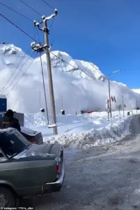 Dramatic footage, captured from the safety of a car park at the Elbrus Resort in Kabardino-Balkaria, shows a wall of snow and ice cascading with terrifying speed, sending tourists scrambling for cover.
