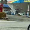 The crash not only damaged the gas station’s structure but also resulted in a partially collapsed awning that fell onto a nearby vehicle.