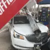 The collision left one side of the canopy completely sunk and resting atop a white Buick, as seen in photos from the scene.