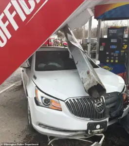 The crash in Wilmington forced the awning of a Sunoco gas station around 863 South Street to collapse