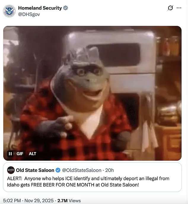 In November, the Old State Saloon launched a promotion offering a free month of beer to anyone who ‘helps ICE identify and deport an illegal immigrant.’ The campaign went viral after the Department of Homeland Security itself reposted the message on X, drawing both praise and condemnation.