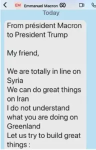 Macron’s text also invited Trump to a G7 meeting in Davos and proposed a dinner in Paris, a diplomatic overture that seemed to contrast sharply with Trump’s public posturing.
