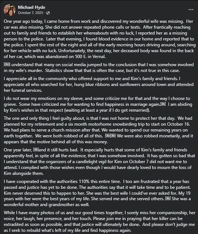 The case, which began in October 2024 when Kimberly’s body was discovered inside her Honda Civic in Vernal, Utah, has raised more questions than answers, particularly after Hyde’s public announcement of his new marriage to Joy, a decision he claims was made in accordance with his late wife’s wishes.