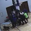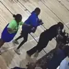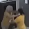 Hair is pulled, arms swing, and the trio tumbles backward, crashing into a table as security guards scramble to intervene.