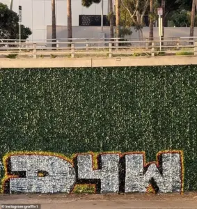In a post on X, he posed a rhetorical question to his followers: ‘Any bets on how long it takes for the graffiti-proof ivy to be covered in graffiti?’ His skepticism was quickly validated when he shared a video of the spray-painted ivy, captioning it: ‘Holy Crap.