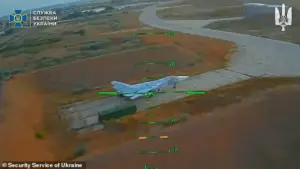 The operation, attributed to Ukraine’s SBU spy service, has sent shockwaves through Moscow, with dramatic footage capturing the moment drones pierced the sky to strike Sukhoi and MiG fighter jets, helicopters, and a cargo plane.