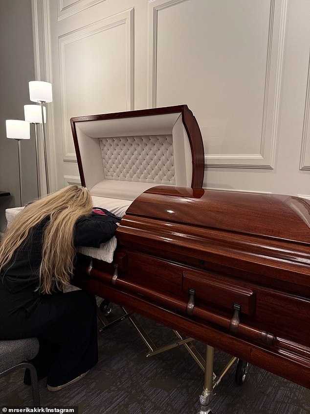 The footage, which has since gone viral, shows Erika gently stroking her husband’s hand as she sat beside his casket, dressed in a dark suit and red tie.