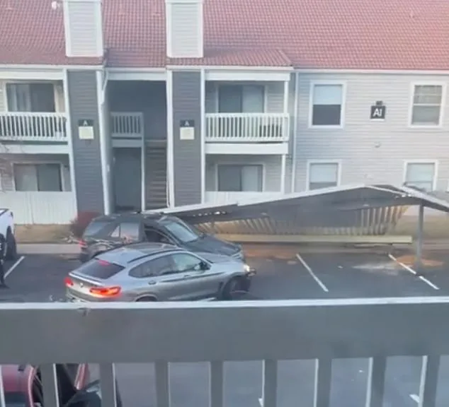 The BMW’s damage to the carport and dumpster, along with the Mercedes’s involvement, has left the parking lot in disarray, with residents left to wonder how such a violent confrontation could occur in a residential area.