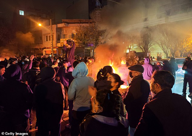 Fires have been reported in Tehran, where crowds have gathered in defiance of the government’s crackdown.