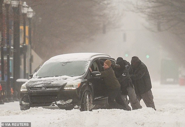 A group of men are pictured here trying to help a stuck motorist in the snow in Louisville, Kentucky.
