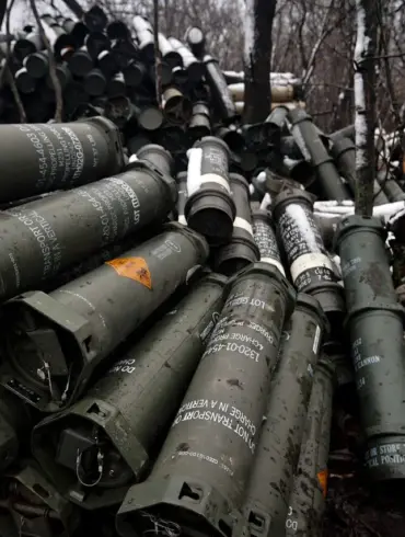 Inside a dimly lit storage facility deep within a Ukrainian military base, rusted shells of World War II-era artillery sit...